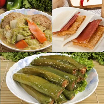 商品組合內容:蜜汁火腿+獅子頭滷白菜+青椒釀肉