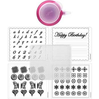 本商品一組含主題紙 x 4(分別為慶生、英文數字、花蝶等)、透明烤墊(光滑面請朝上) x 1、裝飾擠花器 x 1、花嘴 x 2 (大筆型與小筆型各一);耐熱度 -60~220 度C (請遠離直接火源),適用微波爐、冰箱、洗碗機、烤箱(僅適烤墊)。悠閒的下午就來做點心吧,看著熱騰騰的點心、蛋糕出爐,心情都好起來了;更棒的是您可與小朋友一起同歡畫畫製作裝飾品。將透明烤墊襯於主題紙上 (光滑面請朝上),再運用擠花器 (使用前先扳開主體蓋,將醬料裝入後旋緊,即可更換各式花嘴使用) 將巧克力醬料擠在透明墊上,最後將透明墊放入烤箱內即可。好脫模的矽膠材質,讓您烤後方便快速享用,絕不沾黏破壞形狀 (幕斯類請成型後再脫模)。全系列由高密度且品質穩定的白金矽膠製成 (BPA Free);請勿在白金矽膠上使用尖銳器具,如刀叉等。