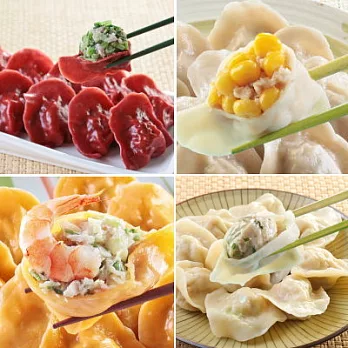 [123水餃](鮮魚+彩色鮑魚+玉米豬肉+鮮蝦+紅麴+干貝水餃(各1盒)(含運)